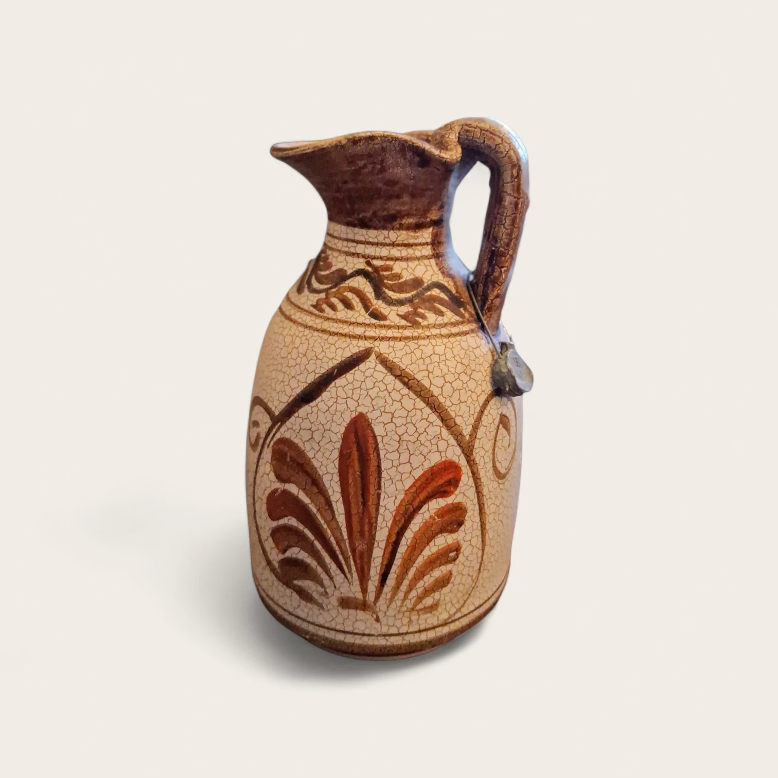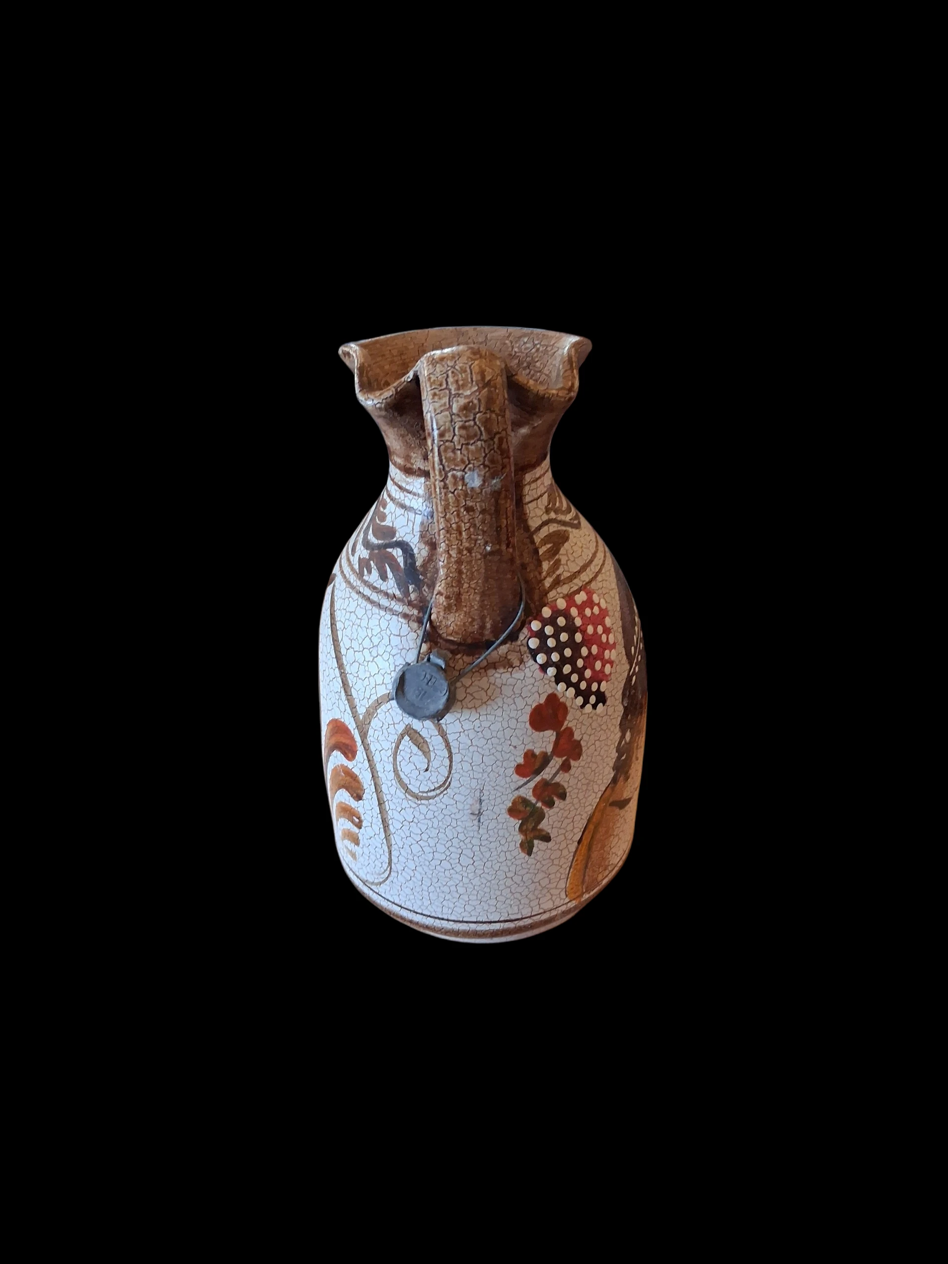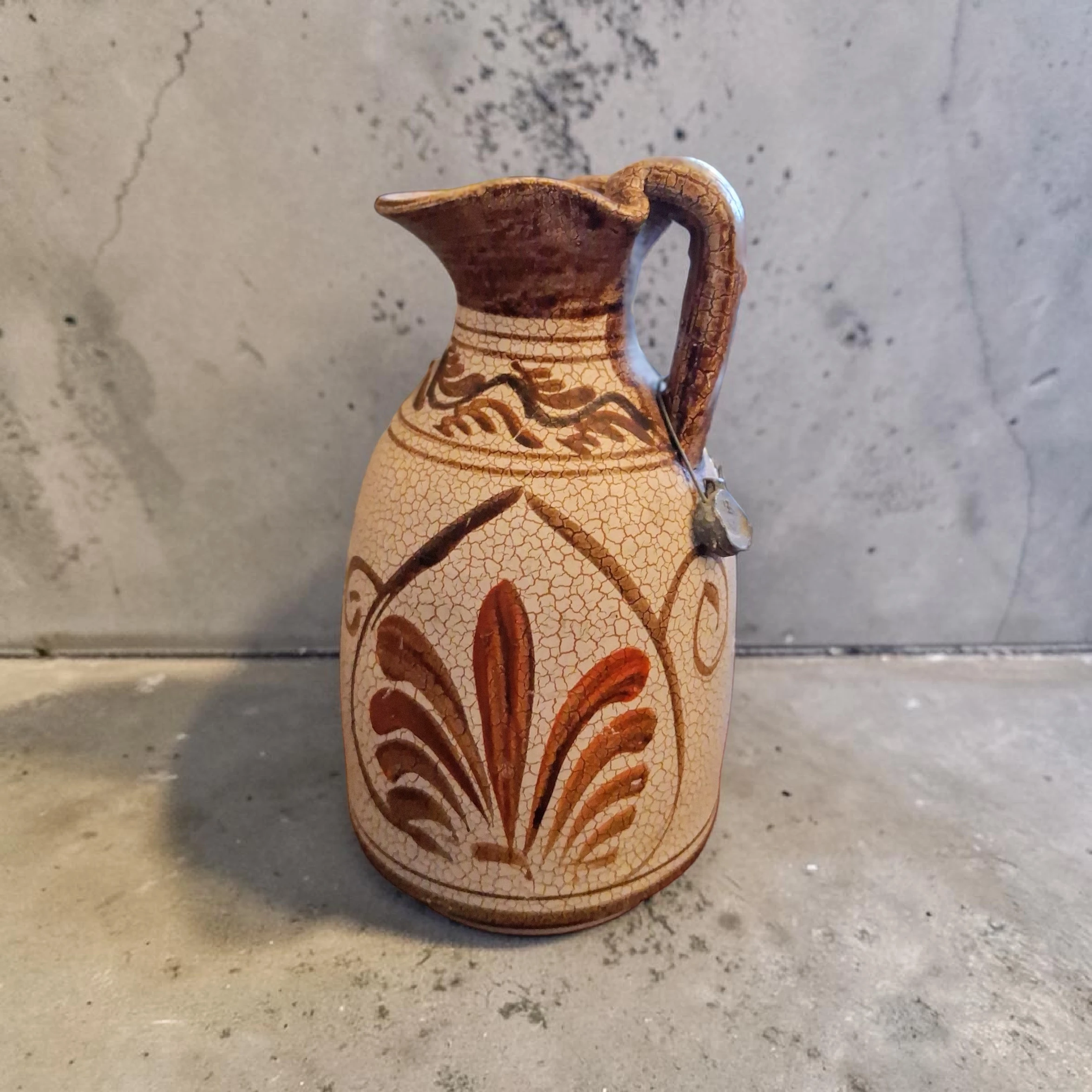 See kaunis keraamiline kann (või käepidemega vaas) on suurepärane leid igale vintage-stiili ja käsitöö austajale. Tootel on iseloomulik “craquelé” ehk pragunemisefektiga glasuur, mis annab sellele autentse antiikse välimuse. Kann on kaunistatud käsitsi maalitud pruunides toonides botaaniliste ja geomeetriliste motiividega, mis meenutavad klassikalist Vahemere või Lääne-Saksa (WGP) keraamikat.