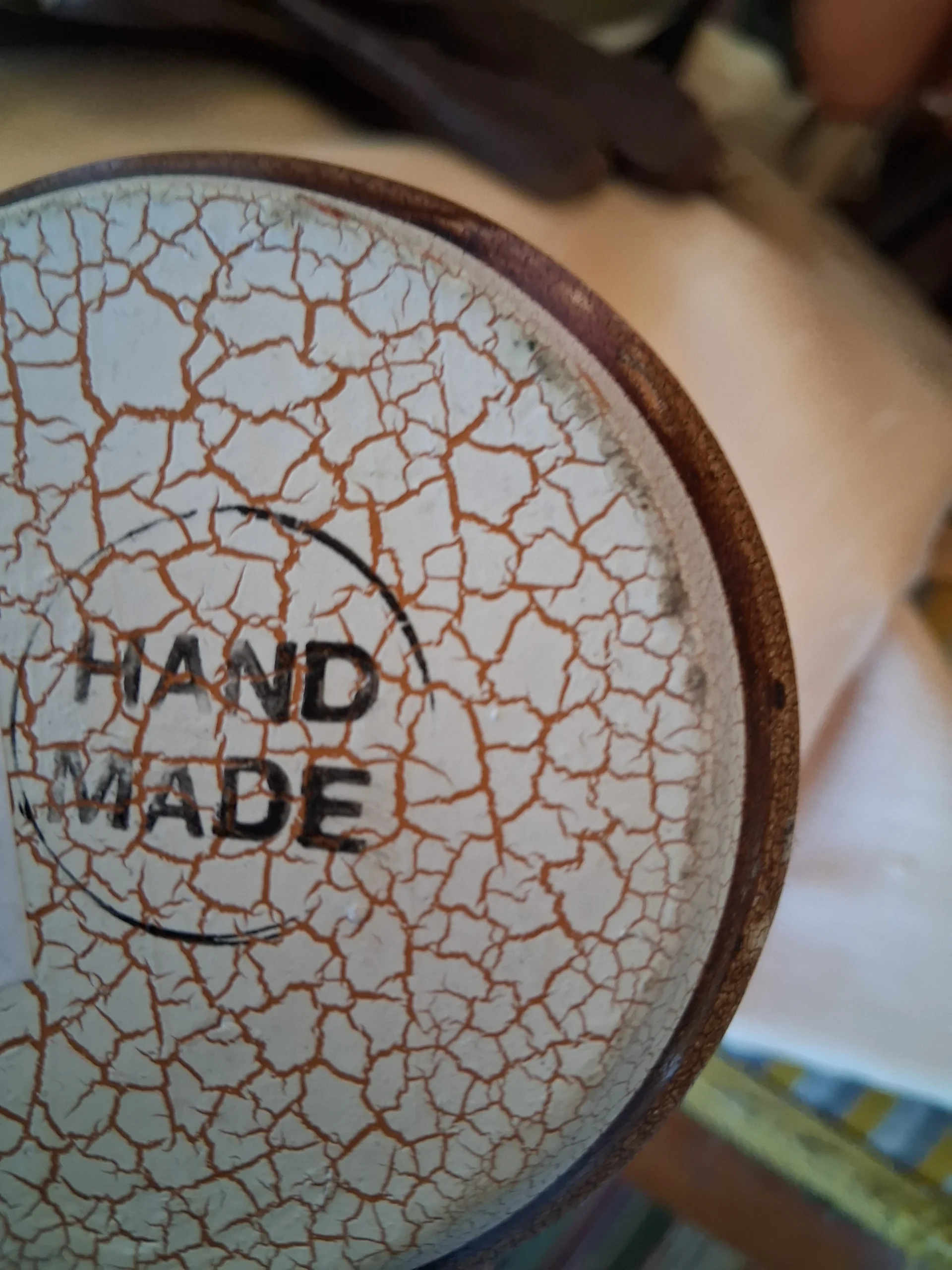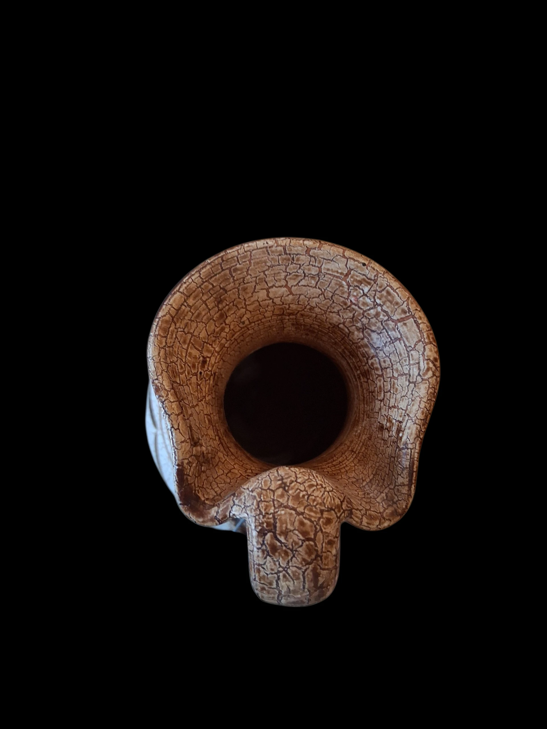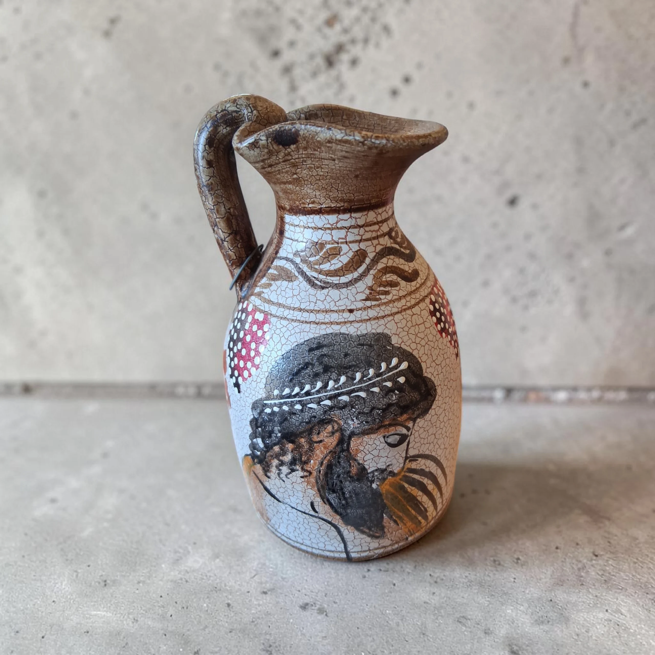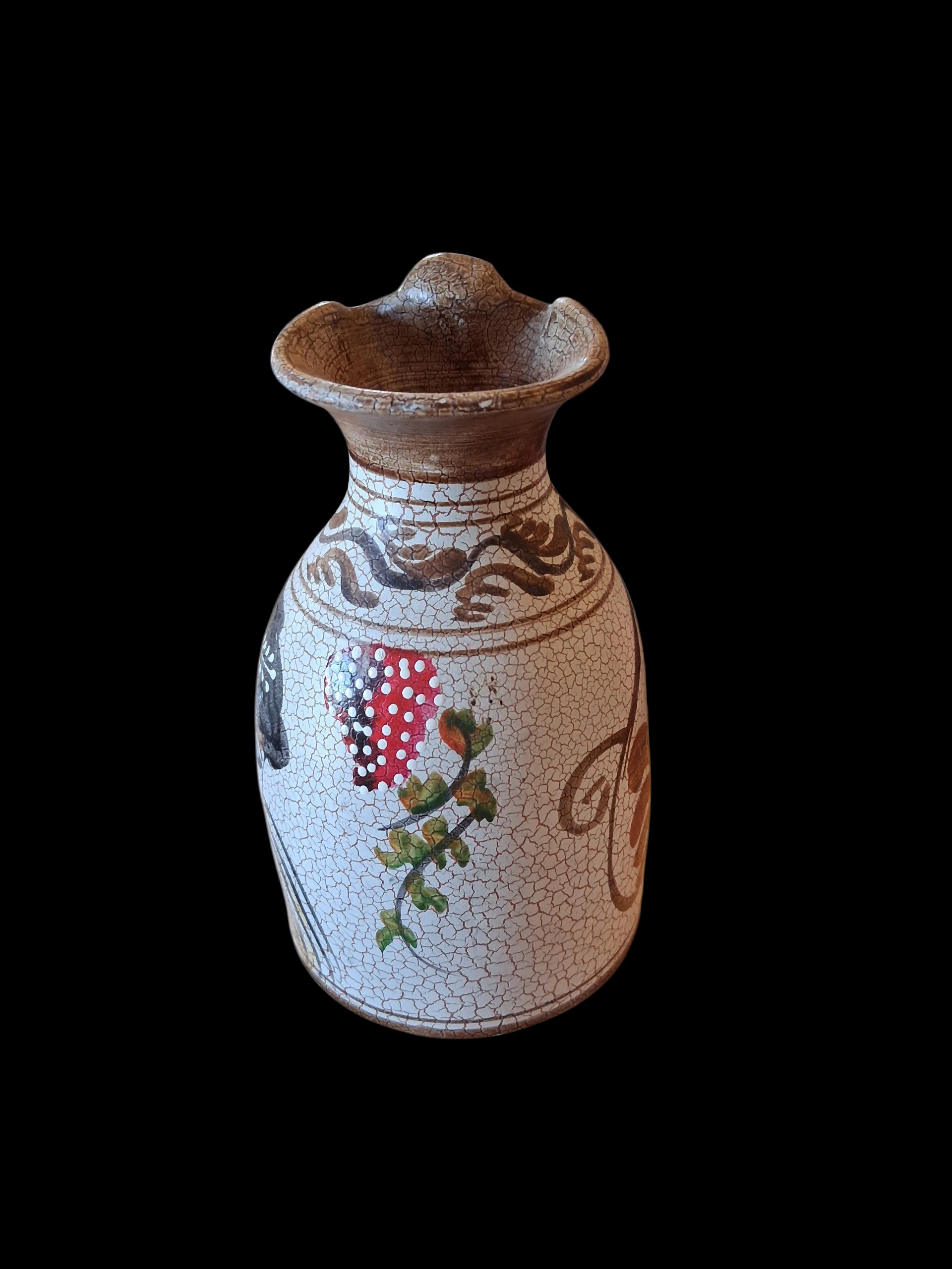 See kaunis keraamiline kann (või käepidemega vaas) on suurepärane leid igale vintage-stiili ja käsitöö austajale. Tootel on iseloomulik “craquelé” ehk pragunemisefektiga glasuur, mis annab sellele autentse antiikse välimuse. Kann on kaunistatud käsitsi maalitud pruunides toonides botaaniliste ja geomeetriliste motiividega, mis meenutavad klassikalist Vahemere või Lääne-Saksa (WGP) keraamikat.
