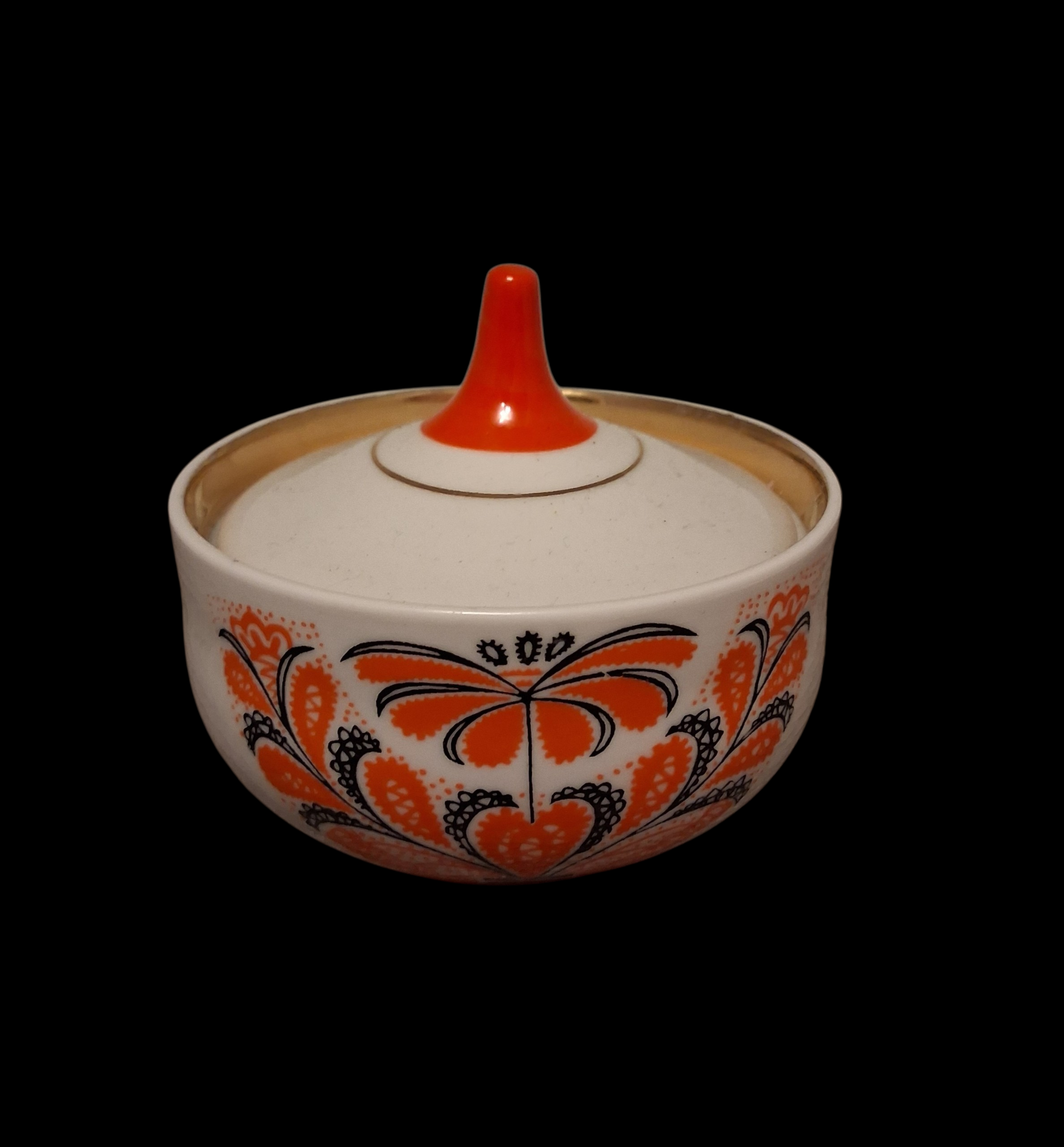 Lisa oma kööki või kollektsiooni killuke ajalugu selle silmapaistva Borysławi portselanitehase suhkrutoosiga. See Ukrainas toodetud vintage-ese on kaunistatud ikoonilise* punase-musta lillemustriga, mis on tuntud kui “Аленький цветочек” (Tulipunane lilleke).