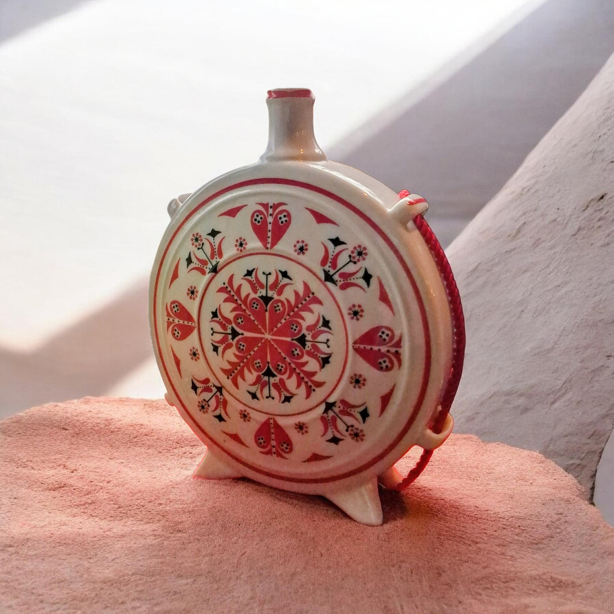 • Kujundus: Pudelil on värviline ja detailne folkloorne muster, mis on sageli käsitsi maalitud. Sellel on tüüpiline lame ümar vorm, väikesed “jalad” toetamiseks ja külgedel olevad avad nööri jaoks, et pudelit oleks mugav kanda.