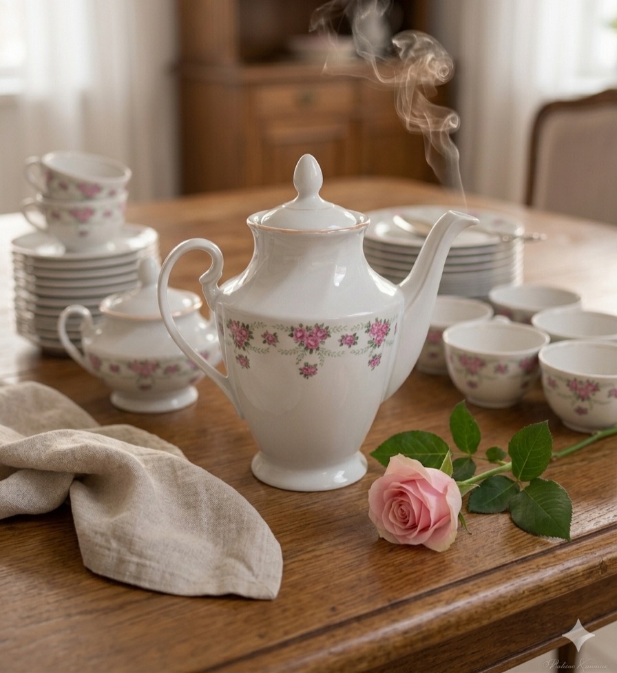 See serviis on klassikaline näide nõukogudeaegsest portselanist, mida iseloomustab romantiline ja funktsionaalne disain.
